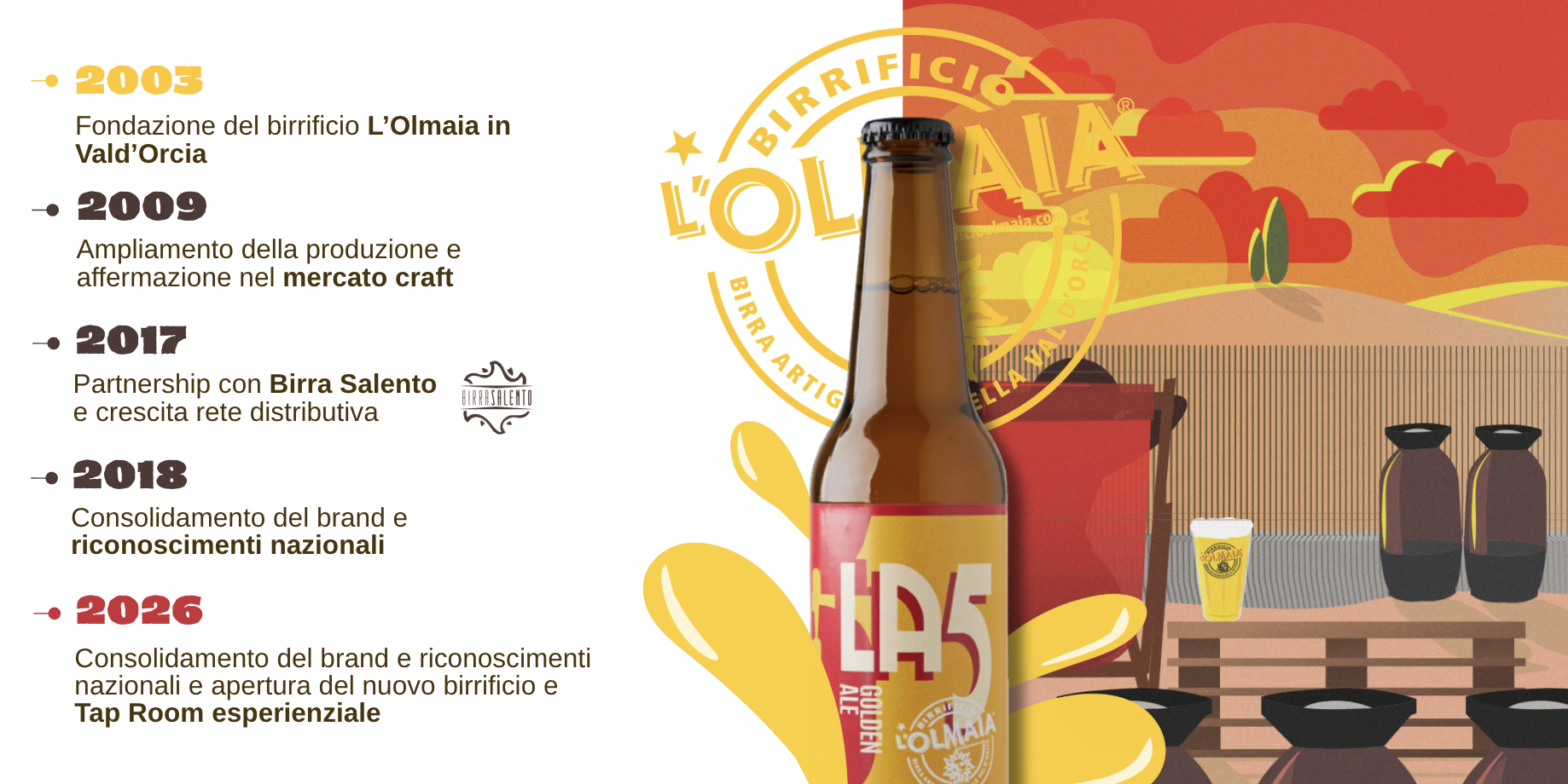 Nata nel 2003 nel cuore della Val d’Orcia, L’Olmaia è uno dei birrifici artigianali più iconici d’Italia. Fondata da Moreno Ercolani e Massimiliano Roncolini, unisce tradizione, creatività e innovazione nella produzione di birre d’autore come La5, La9 e BK. Grazie alla partnership strategica con Birra Salento, il birrificio ha avviato una nuova fase di crescita con ampliamento degli impianti, creazione di una Tap Room esperienziale e sviluppo di linee innovative, anche bio e low-alcohol. La campagna di equity crowdfunding su CrowdFundMe sostiene questo progetto di espansione, offrendo agli investitori la possibilità di entrare nel futuro della birra artigianale toscana, simbolo di autenticità e passione italiana.