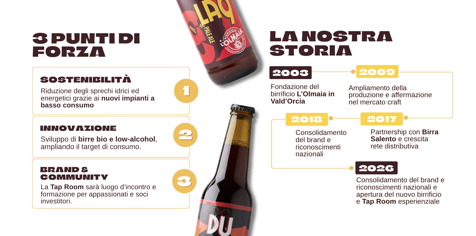 Il mercato della birra artigianale è in costante crescita: +12% medio annuo in Italia e trend positivo anche in Europa. La domanda si orienta verso prodotti autentici, sostenibili e di alta qualità. L’Olmaia, con oltre 20 anni di esperienza e un brand riconosciuto, è pronta a cogliere questa espansione con un modello produttivo flessibile e una rete commerciale in espansione.