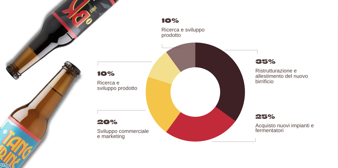 - 35% – Ristrutturazione e allestimento del nuovo birrificio: lavori di adeguamento strutturale e impiantistico, realizzazione della Tap Room e del Beer Garden.