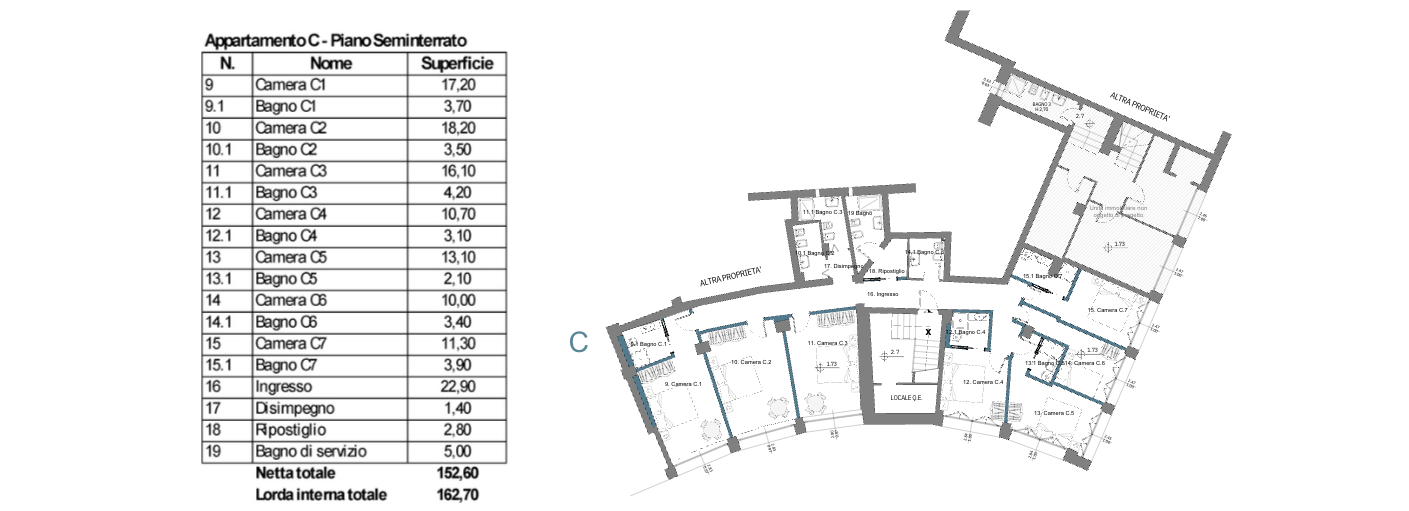 - Unità C (piano seminterrato): 162,7 m² – 7 camere