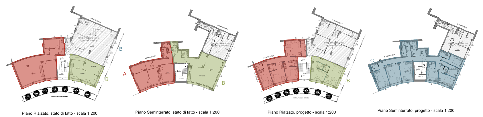 Distribuzione interna e ottimizzazione degli spazi – Piano seminterrato (UI C) – Il piano seminterrato è stato completamente riorganizzato per creare una terza unità immobiliare autonoma (Unità C) di circa 162 m². L’appartamento comprende sette camere da letto, di cui quattro con bagno privato in camera e tre con bagno dedicato accessibile dal corridoio distributivo comune e un ripostiglio con bagno di servizio.