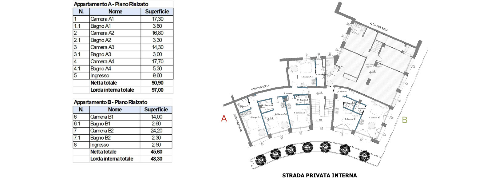 - Unità A (piano rialzato): 97 m² – 4 camere