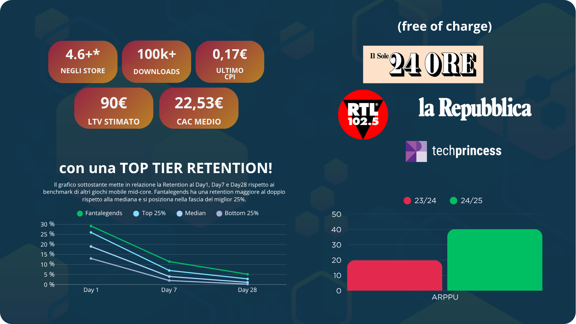 Fantalegends ha superato i 100.000 download con una retention superiore del 100% rispetto ai benchmark di settore. Il Lifetime Value stimato è pari a €90, con un CAC medio di €22,53.