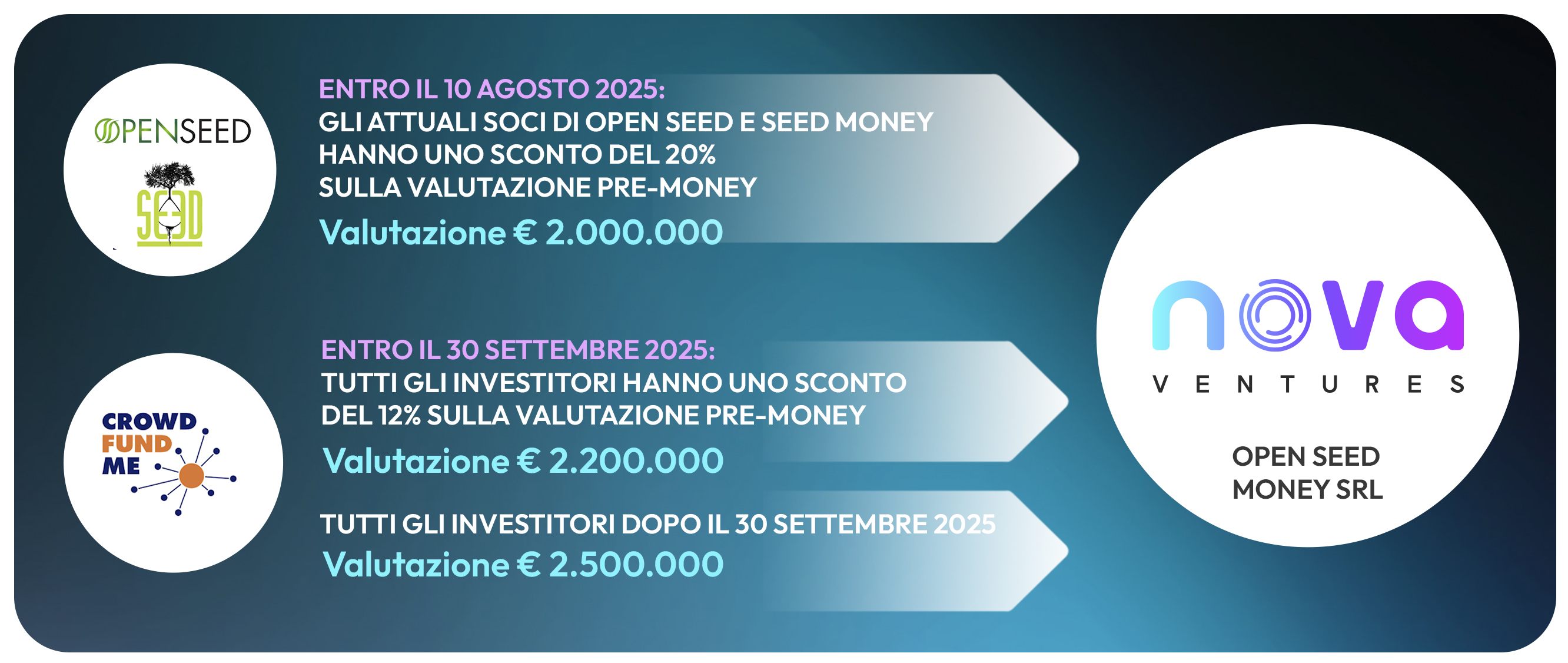 1) Fase riservata ai soci attuali: sconto del 20%, corrispondente a una valutazione di 2,0 milioni di euro per tutti gli attuali soci di Open Seed srl e Seed Money srl che hanno investito entro il 10 agosto 2025;